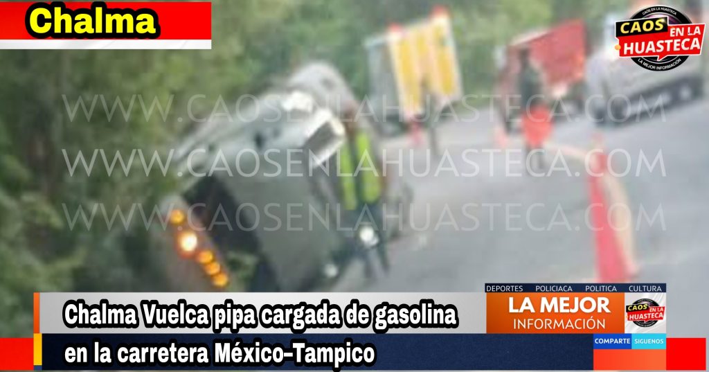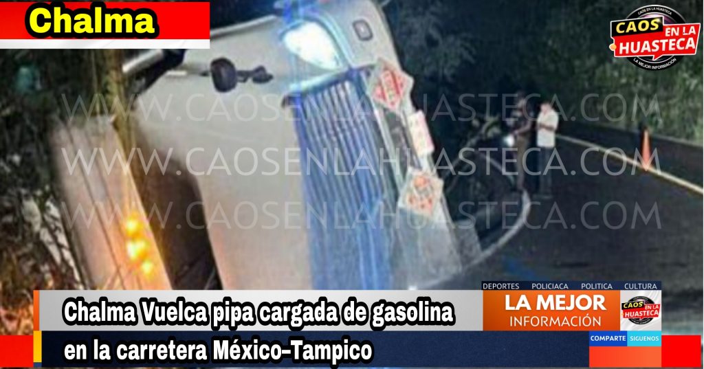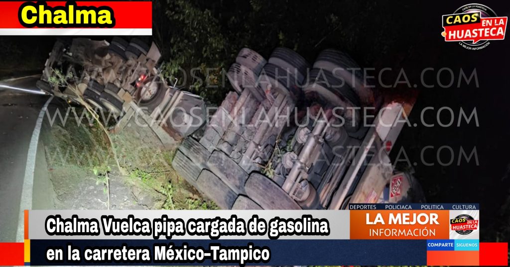 Chalma, Ver.– La madrugada de este viernes se registró un accidente de alto riesgo en la carretera México–Tampico, a la altura de la entrada a la cabecera municipal de Chalma, donde una pipa cargada con gasolina volcó, provocando el derrame de combustible.