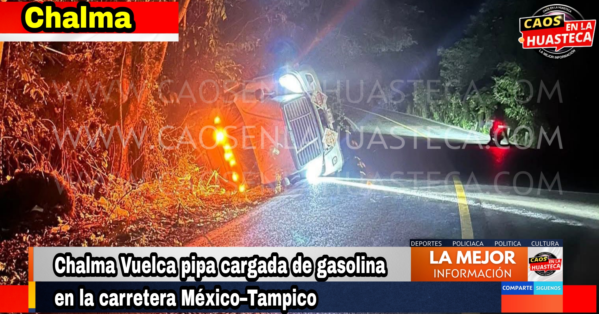 Chalma, Ver.– La madrugada de este viernes se registró un accidente de alto riesgo en la carretera México–Tampico, a la altura de la entrada a la cabecera municipal de Chalma, donde una pipa cargada con gasolina volcó, provocando el derrame de combustible.