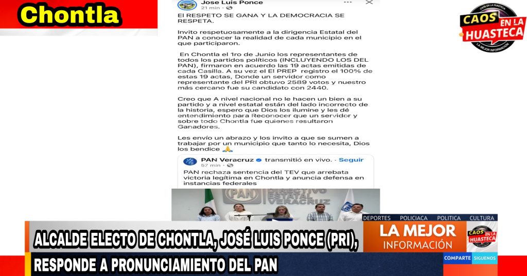 Chontla, Ver. – Luego de que el Comité Directivo Estatal del PAN rechazara la resolución del Tribunal Electoral de Veracruz (TEV) y anunciara que acudiría a instancias federales para impugnar la elección en Chontla, el alcalde electo por el PRI, José Luis Ponce, emitió un mensaje en redes sociales donde fijó su postura.