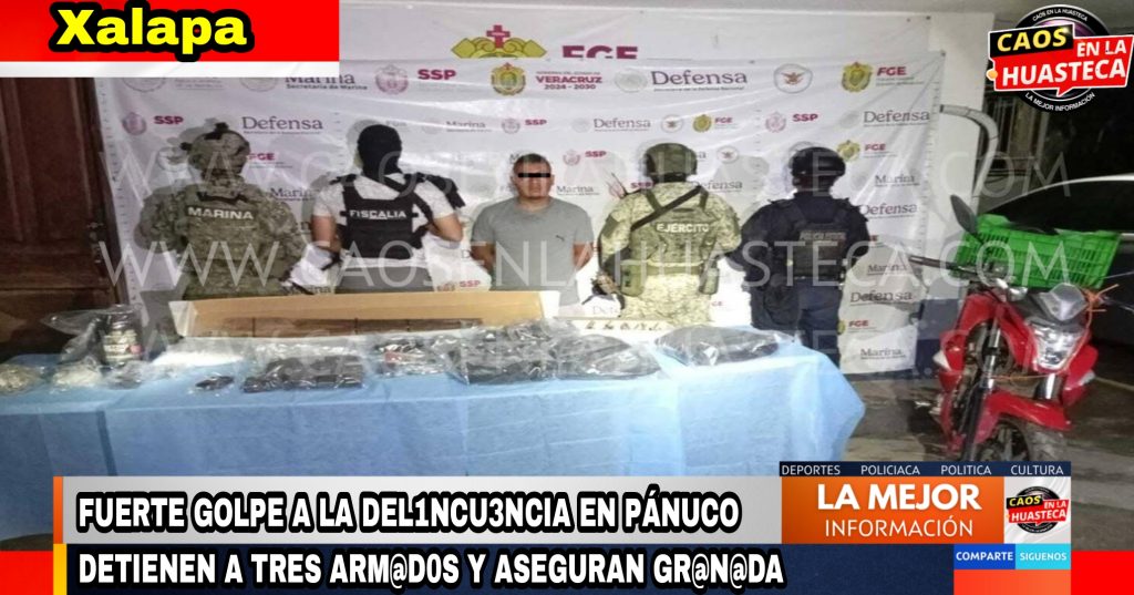 Xalapa, Ver.– Un importante operativo de la Secretaría de Seguridad Pública (SSP) en coordinación con la Secretaría de Marina, la Secretaría de la Defensa Nacional y la Guardia Nacional, permitió el aseguramiento de armamento y explosivos, además de la detención de cuatro personas en los municipios de Coxquihui y Pánuco, Veracruz.En el caso de Pánuco, fuerzas del orden capturaron a tres personas, entre ellas una mujer, asegurándoles armas largas y cortas, una granada de fragmentación, cargadores, chalecos tácticos, placas balísticas y aros aprehensores, además de gorras con leyendas alusivas a un grupo delictivo.