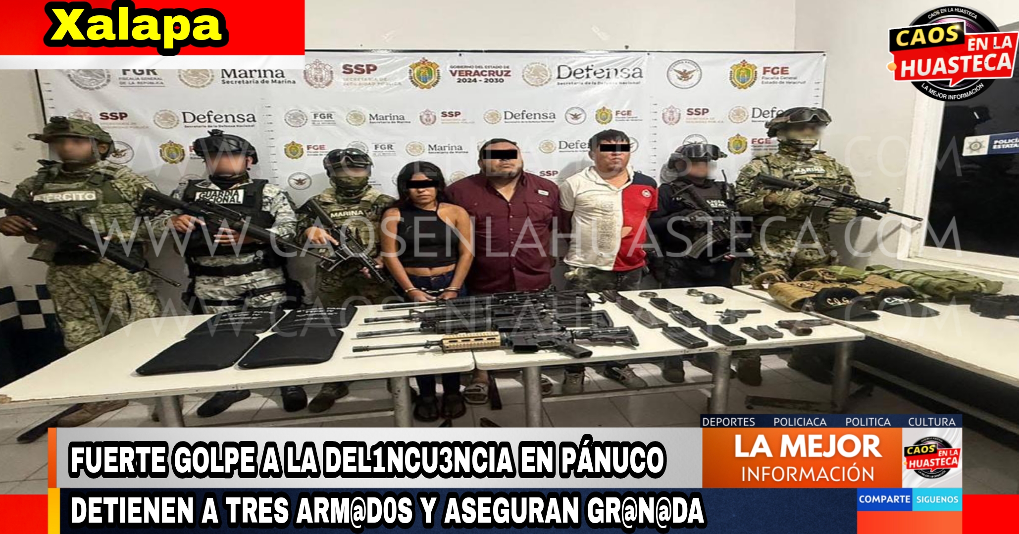 Xalapa, Ver.– Un importante operativo de la Secretaría de Seguridad Pública (SSP) en coordinación con la Secretaría de Marina, la Secretaría de la Defensa Nacional y la Guardia Nacional, permitió el aseguramiento de armamento y explosivos, además de la detención de cuatro personas en los municipios de Coxquihui y Pánuco, Veracruz.En el caso de Pánuco, fuerzas del orden capturaron a tres personas, entre ellas una mujer, asegurándoles armas largas y cortas, una granada de fragmentación, cargadores, chalecos tácticos, placas balísticas y aros aprehensores, además de gorras con leyendas alusivas a un grupo delictivo.