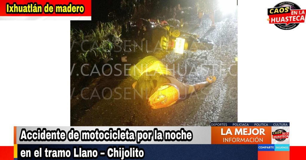 Ixhuatlán de Madero, Ver., 25 de septiembre de 2025. – Durante la noche de este jueves, se registró un accidente de motocicleta en el tramo carretero Llano – Chijolito, en el municipio de Ixhuatlán de Madero.