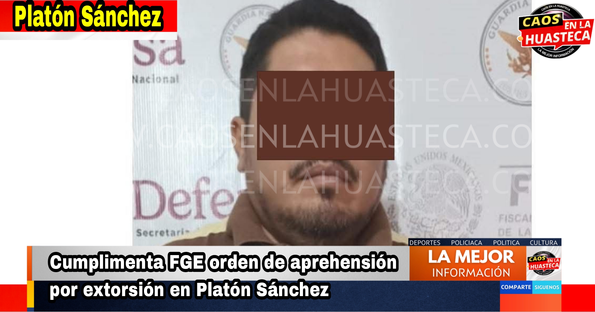 Platón Sánchez, Ver., 26 de septiembre de 2025.- La Fiscalía General del Estado informó que elementos de la Policía Ministerial ejecutaron una orden de aprehensión en este municipio en contra de Fernando “N”, señalado como presunto responsable del delito de extorsión.De acuerdo con las autoridades, el ilícito fue cometido en agravio de una víctima cuya identidad se mantiene bajo resguardo, a fin de proteger su integridad.