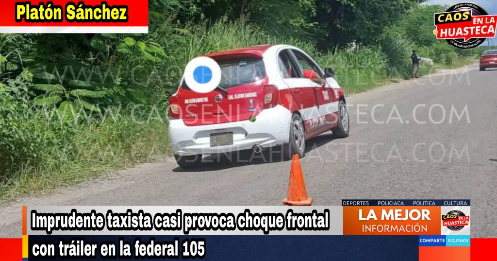 Platón Sánchez, Ver.– Un taxista de la ruta Platón Sánchez–Huejutla puso en riesgo a sus pasajeros al desobedecer las señales de un abanderado de obra en la carretera federal 105 México–Tampico. El incidente ocurrió al mediodía, en el tramo Platón–Chalma, a la altura de la capilla de la Santísima Muerte.El vehículo, un Nissan March habilitado como taxi con número económico 41, ignoró la indicación de alto y avanzó, quedando de frente con un tráiler que circulaba por la vía.
