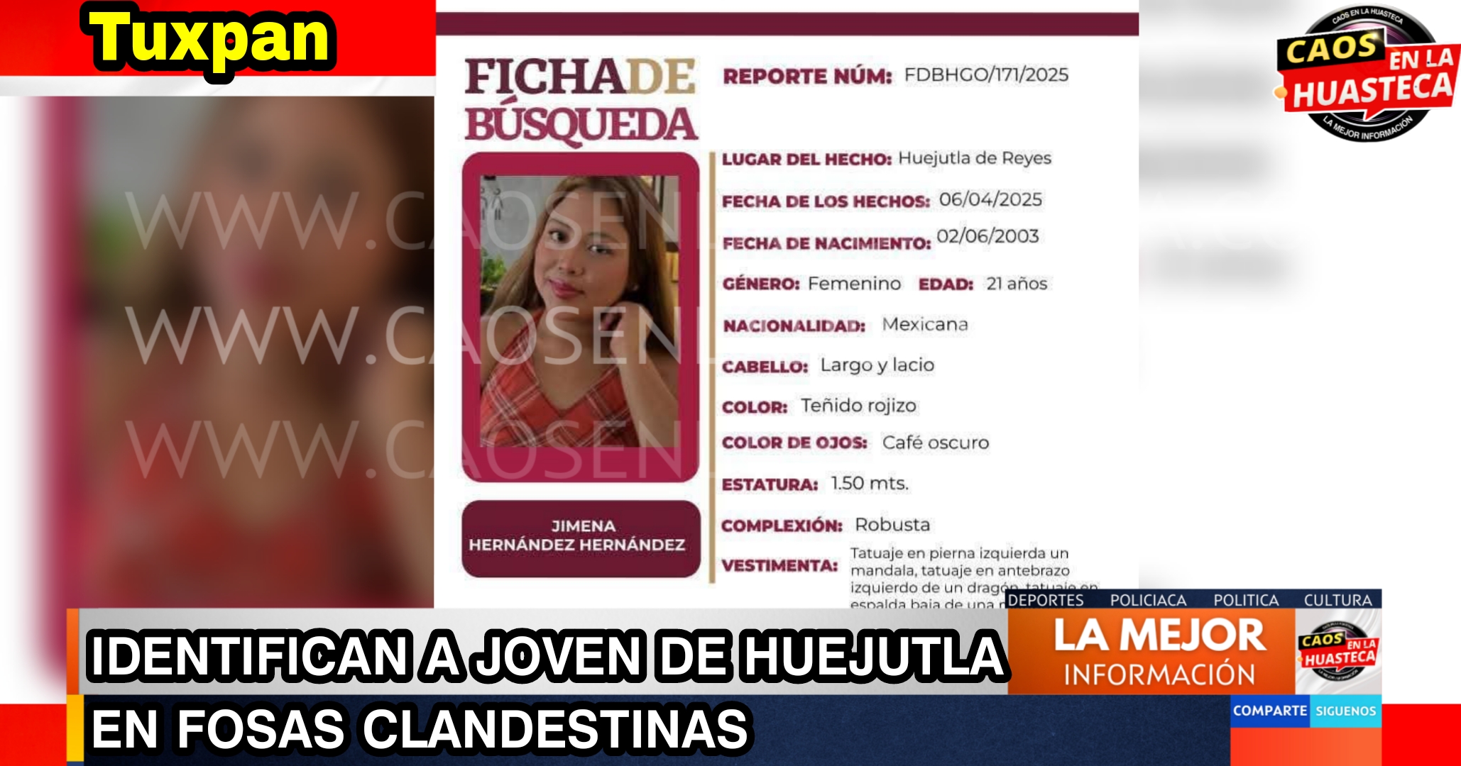 Tuxpan, Ver., 28 de septiembre de 2025.โ La Fiscalรญa General del Estado confirmรณ la identidad de Jimena Hernรกndez Hernรกndez, joven de 21 aรฑos originaria de Huejutla, Hidalgo, entre los restos exhumados en las fosas clandestinas localizadas en la comunidad de Tepetzintlilla, municipio de รlamo Temapache, en la zona limรญtrofe con #CerroAzul.Jimena desapareciรณ el pasado 6 de abril y desde entonces era buscada por su familia y colectivos de la regiรณn. Tras los estudios genรฉticos realizados por peritos forenses, se logrรณ corroborar su identidad y el cuerpo fue entregado a sus familiares.El hallazgo se dio en el rancho Santa Rosalรญa, donde desde agosto autoridades ministeriales realizan trabajos de exhumaciรณn.