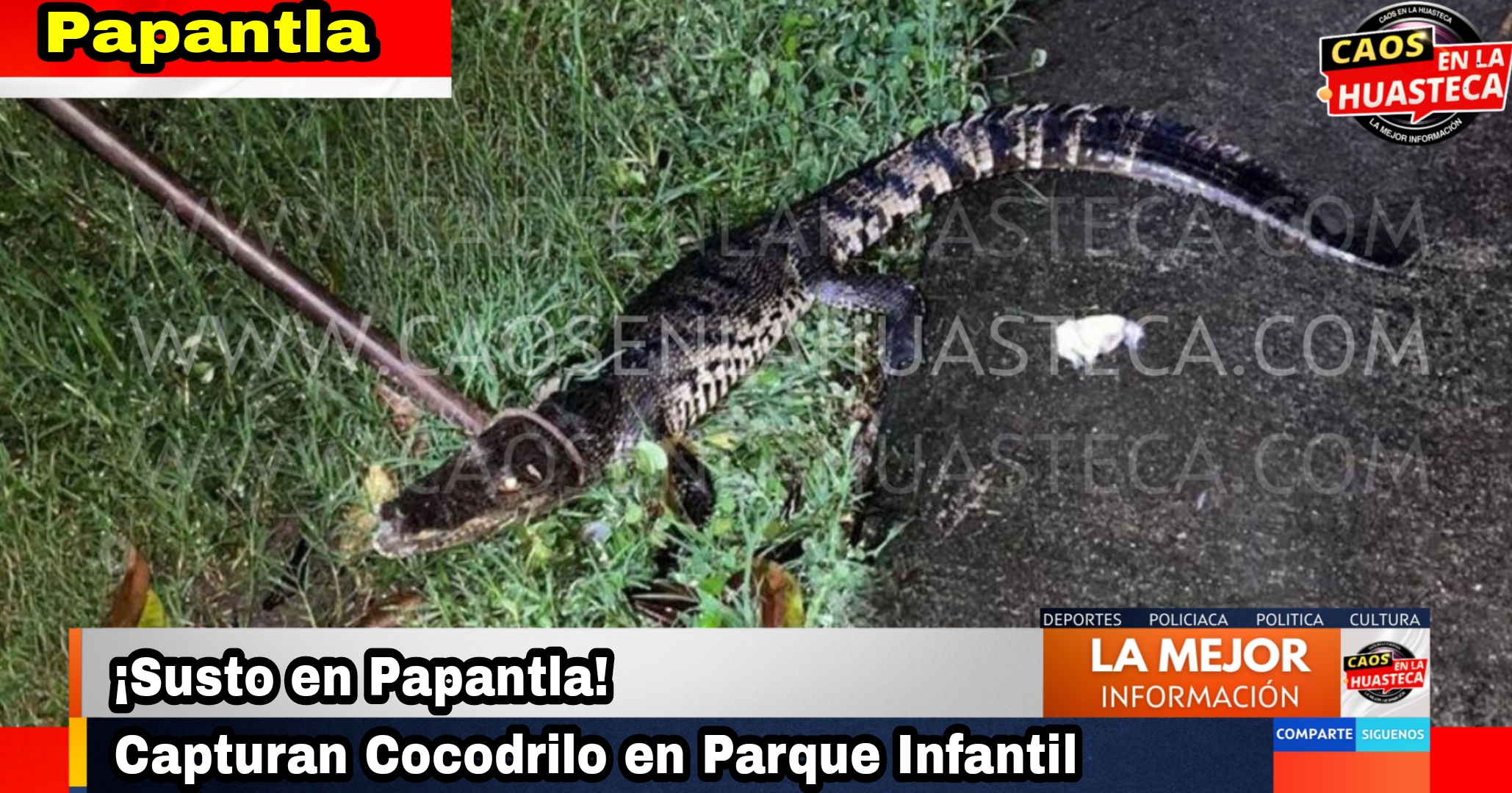 Papantla, Veracruz | Una inusual visita generó una rápida movilización de los elementos de Protección Civil de Papantla, luego de que un cocodrilo fuera capturado dentro de las instalaciones del parque infantil «Lakatsiyawa», popularmente conocido como «En pleno vuelo».Según el reporte, el vigilante del parque se percató de que el reptil merodeaba en la zona, por lo que dió aviso a las autoridades correspondientes. Inmediatamente, personal del cuerpo de Protección Civil Municipal, coordinado por el director Jorge Olarte, se trasladó al sitio, logrando asegurar al ejemplar.Aún se desconoce cómo llegó el cocodrilo a este espacio recreativo. Si bien se presume que las recientes lluvias pudieron haber contribuido a su desplazamiento, las autoridades han iniciado una investigación para esclarecer los hechos.