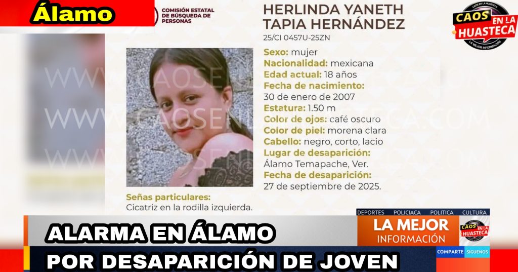 Álamo, Ver. – La preocupación crece en el municipio de Álamo Temapache ante el aumento de casos de mujeres desaparecidas, sumado al reciente hallazgo de restos humanos de tres mujeres en fosas clandestinas del rancho Santa Rosalía, comunidad de Tepetzintlilla.En este contexto, la Comisión Estatal de Búsqueda de Veracruz emitió una nueva ficha para localizar a Herlinda Yaneth Tapia Hernández, joven de 18 años, vista por última vez el pasado 27 de septiembre en este municipio.De acuerdo con la descripción oficial, Herlinda mide 1.50 metros, tiene ojos café oscuro, piel morena clara y cabello negro, corto y lacio.