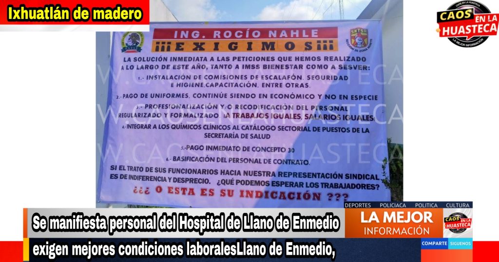 Ixhuatlán de Madero, Ver.- Desde temprana hora de este martes, personal del Hospital de Llano de Enmedio se sumó a la manifestación estatal que realizan trabajadores del sistema SESVER e IMSS Bienestar, con el fin de exigir a la gobernadora Rocío Nahle García una solución inmediata a las demandas laborales que, aseguran, han sido ignoradas durante todo el año.Entre los puntos principales de su pliego petitorio destacan: la instalación de comisiones de escalafón, seguridad e higiene, así como de capacitaciones; el pago de uniformes en efectivo y no en especie; la profesionalización y recodificación del personal regularizado y formalizado bajo el principio de “a trabajos iguales, salarios iguales”; además de la integración de los químicos clínicos al catálogo sectorial de puestos de la Secretaría de Salud, el pago inmediato del concepto 30, y la basificación del personal por contrato.