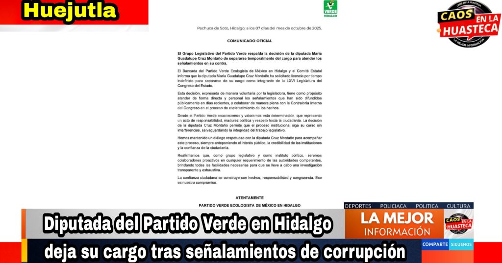 Huejutla, Hgo.- La diputada local Guadalupe Cruz Montaño, representante del Partido Verde Ecologista de México (PVEM) por el distrito de Huejutla, presentó su renuncia al cargo luego de ser señalada por presuntos actos de corrupción relacionados con el desvío de más de 200 mil pesos del Congreso del Estado de Hidalgo.