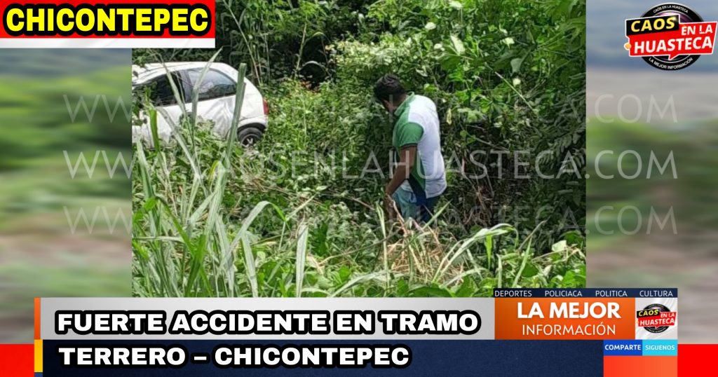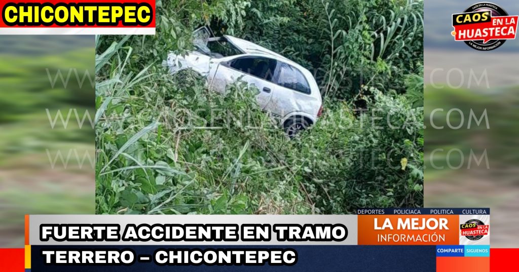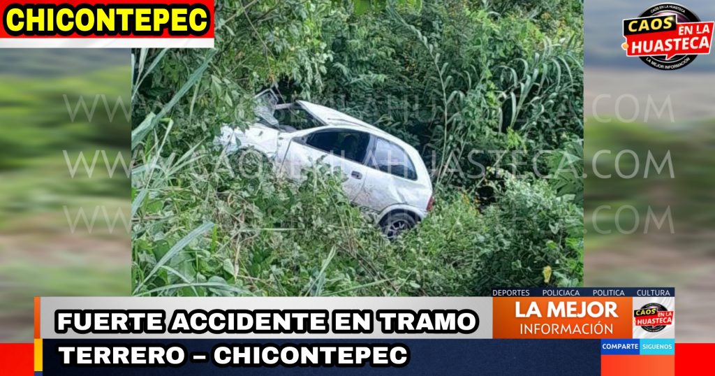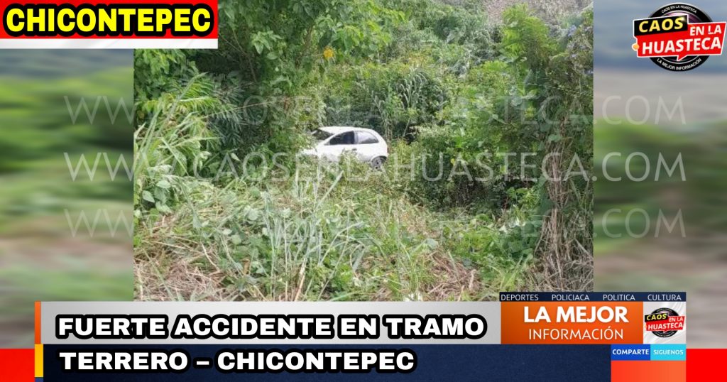 Chicontepec, Ver. – Un aparatoso accidente se registró la tarde de este lunes sobre el tramo Terrero–Chicontepec, donde un vehículo particular terminó fuera de la carretera tras perder el control en una peligrosa curva.De acuerdo con los primeros reportes, en el incidente se vio involucrado un automóvil Chevrolet Chevy, cuyo conductor y acompañantes son originarios de la comunidad de Colatlán, municipio de Ixhuatlán de Madero.